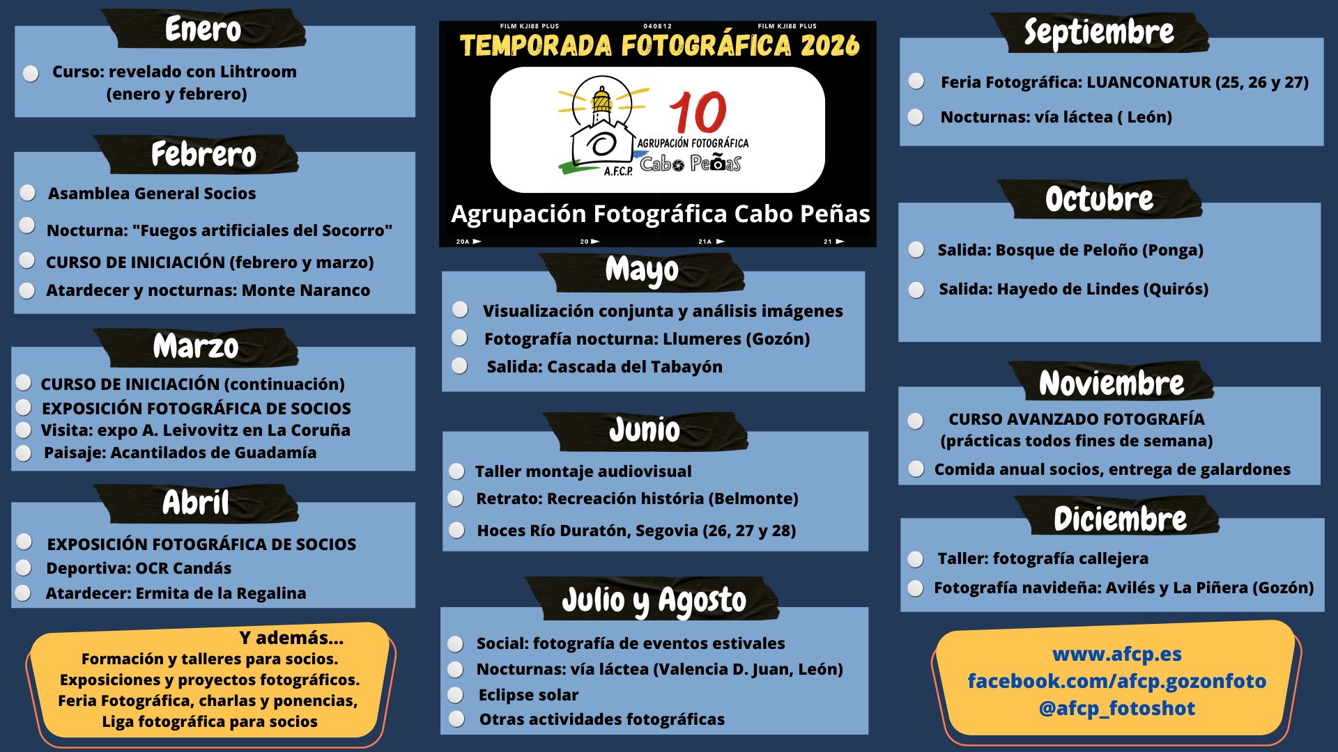 Bienvenidos al sitio web de la Agrupación Fotográfica Cabo Peñas. En nuestra asociación fomentamos y divulgamos la práctica fotográfica. Para nosotros lo más importante es disfrutar de esta pasión en la mejor compañía. Damos la mayor importancia a la formación de nuestros socios. Realizamos talleres, cursos, salidas fotográficas y muchas otras actividades.