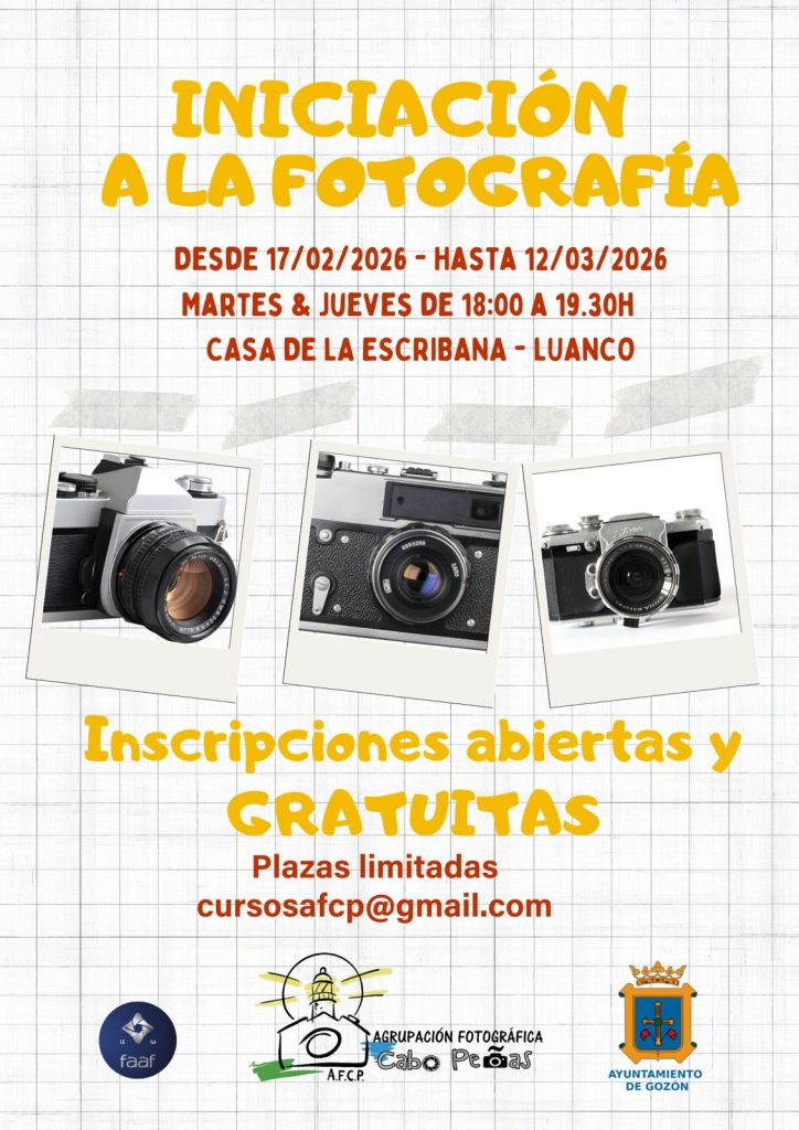 Organizamos un nuevo curso de iniciación a la fotografía. Se realizará durante el mes de mayo. Si te interesa la fotografía, si quieres hacer fotos geniales, este es el momento. A partir del 6 de mayo, martes y jueves en horario de tarde en la Casa Municipal de la Escribana de Luanco, Gozón.